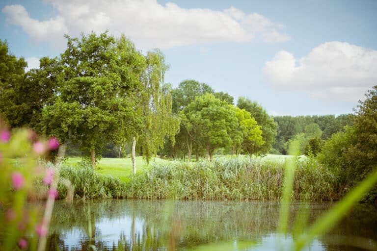 Een goed voorbeeld hiervan is de teebox van hole D1. Waar je nu vooral tegen bomen, riet en bramen aankijkt. Daarachter ligt een schitterende vijver die straks weer zichtbaar wordt.