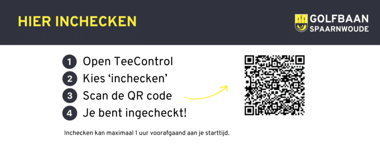 Kom je golfen dan kun je maximaal 1 uur voorafgaand aan je starttijd online inchecken. Scan de QR code op de posters in de receptie met je TeeControl Webapp. Check je liever in bij de balie dan mag dat ook.